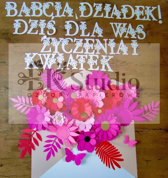 - 1x napis - Babcia, Dziadek! Dziś dla Was życzenia i kwiatek! -
