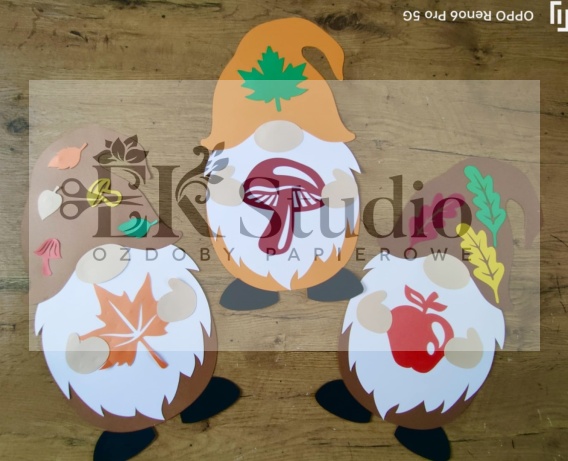 3x Krasnal 42 cm. Poszczególne elementy cięte maszynowo, ręcznie klejone. Plus 10 liści klonu do dekoracji